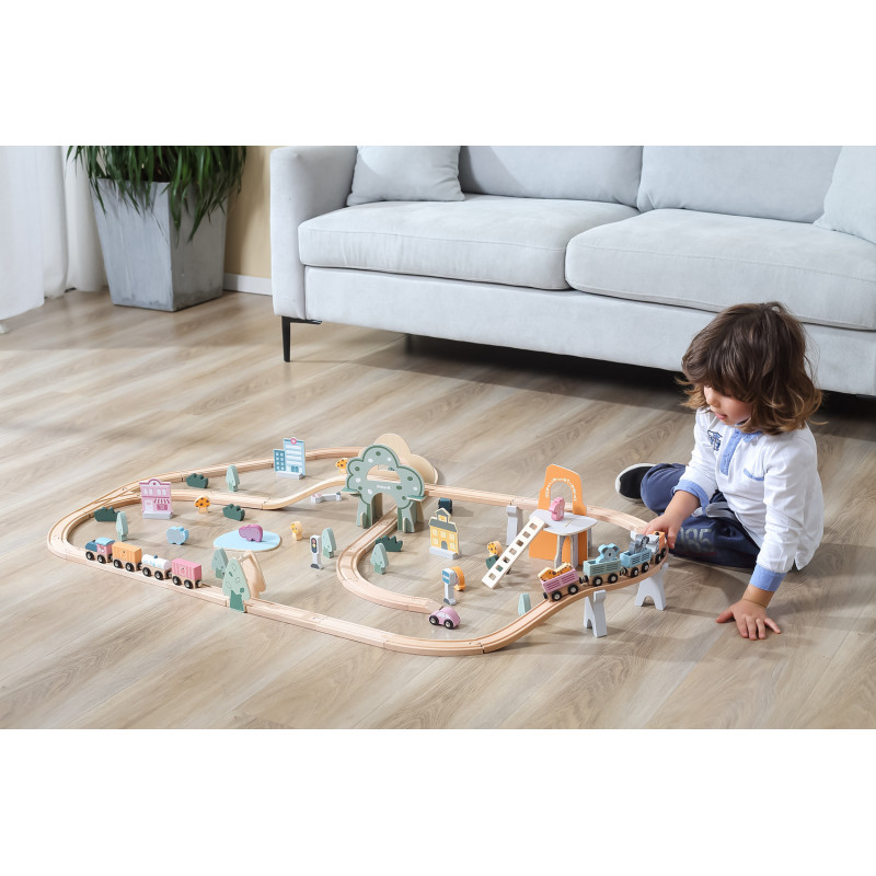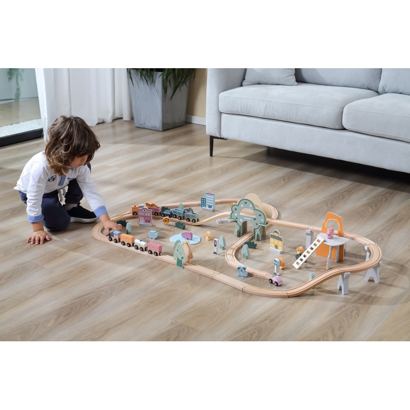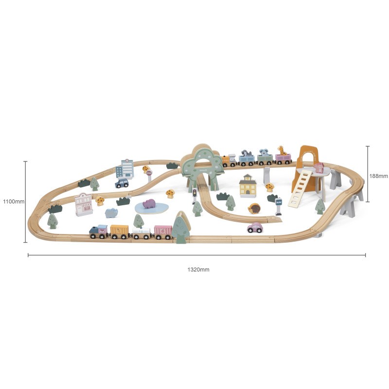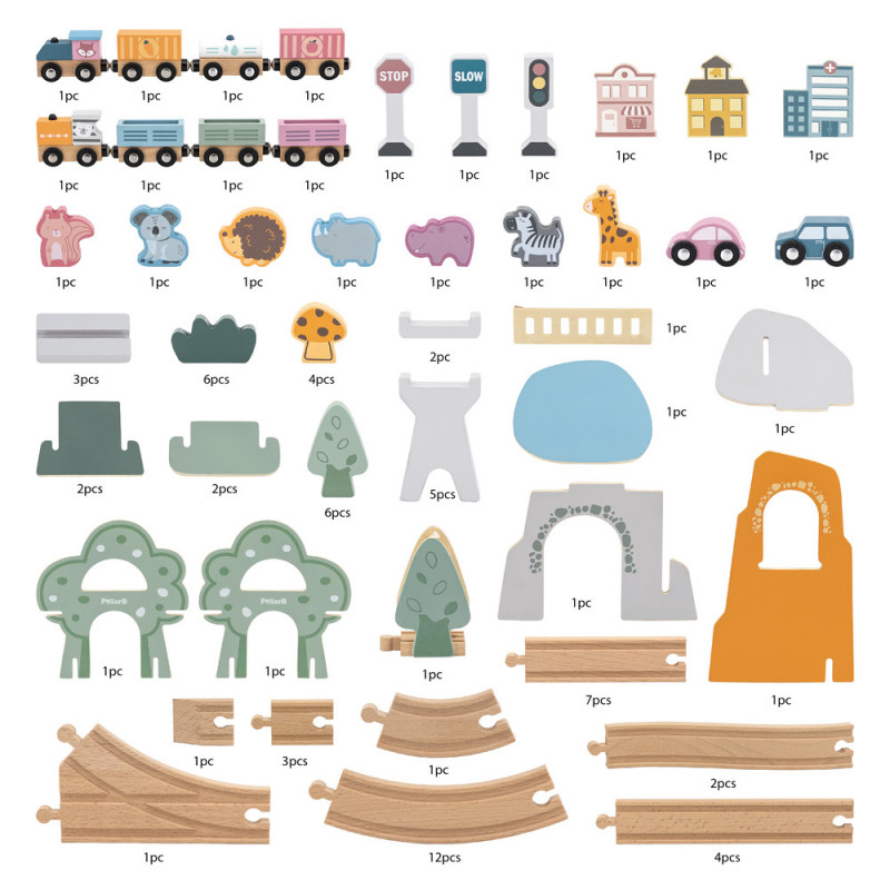 Acest set de trenulete din lemn cu 90 de piese vine cu o varietate de accesorii si piese de joaca care pot fi folosite pentru a construi un oras distractiv pentru adorabilele animale.