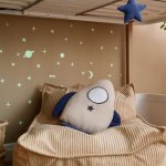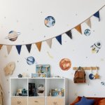 Acest pachet decorativ este creat special pentru camera unui mic visator pasionat de spatiu! Baldachinul bleumarin, perna in forma de racheta si ghirlanda asortata transforma orice patut intr-o capsula de explorare cosmica. Materialele sunt moi, sigure pentru pielea sensibila si realizate manual cu grija in Germania.