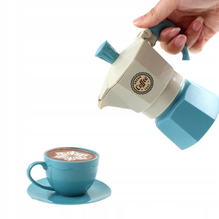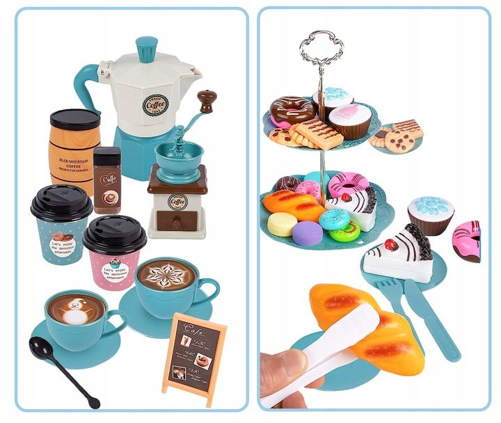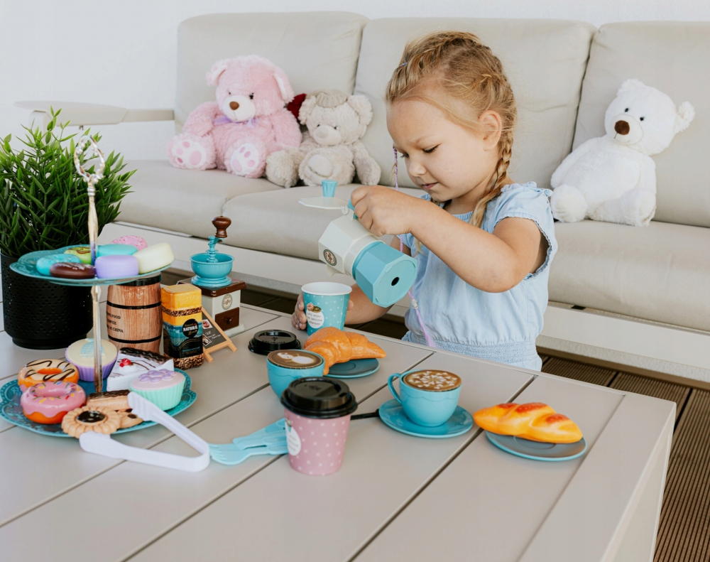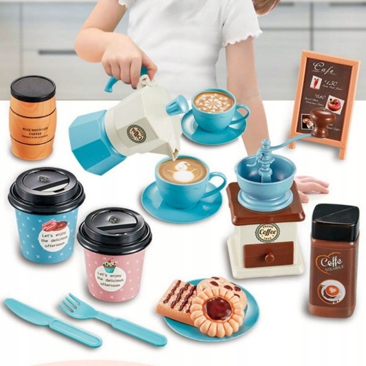 Un set extrem de practic contine tot ce va fi de folos intr-o cafenea pentru copii, o cofetaria, cand se servesc papusi si ursuleti, precum si pentru un mic barista destul de profesionist.