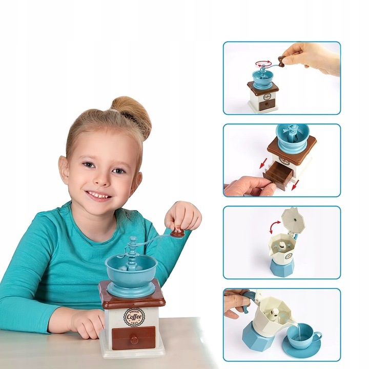 Jucariile arata foarte realiste. Rasnita are un sertar care se deschide si un maner mobil care poate fi rotit pentru a simula macinarea cafelei.