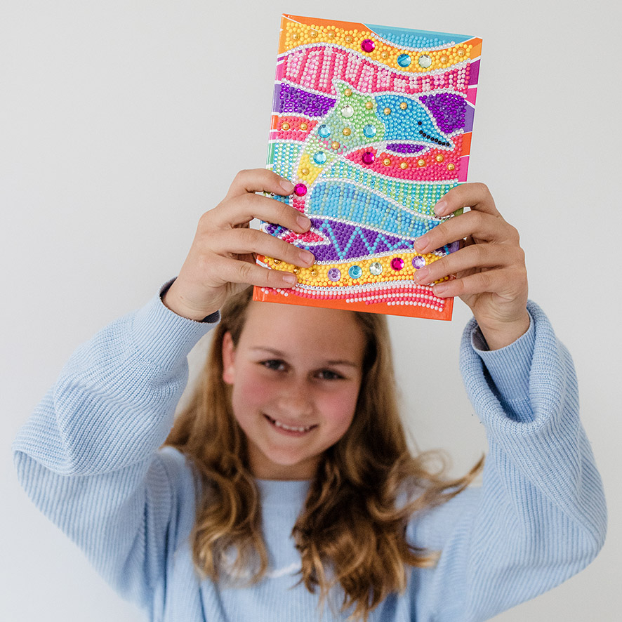 Decoreaza-ti propriul jurnal cu designul unui delfin preimprimat folosid tehnica diamond paint!