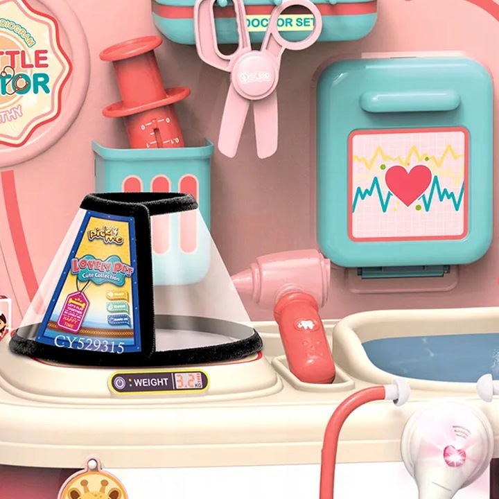 Setul include accesorii medicale si de ingrijire pentru o simulare completa a unei vizite la veterinar:
