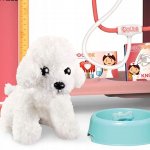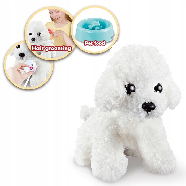 Setul include un caine moale, de plus, alb, caruia copiii ii pot oferi grija si dragoste.
