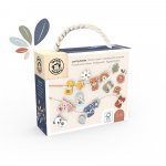 Acest set include 16 piese figurine din lemn colorat, în diverse forme și 2 șireturi pentru înșirat.