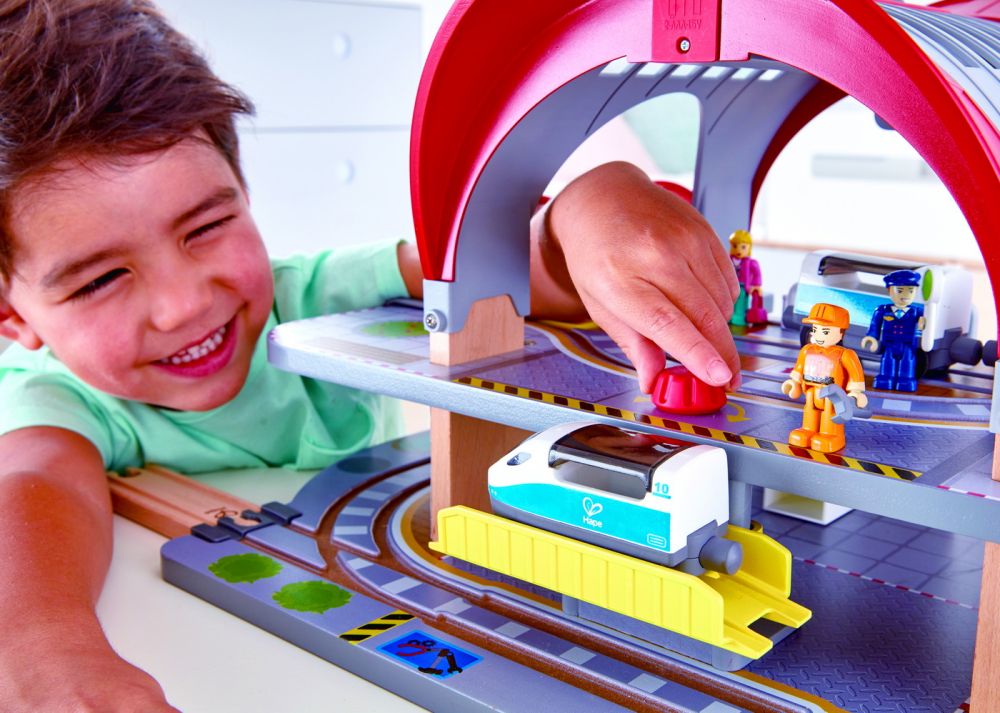 Alege destinatie si asigura-te ca toti pasagerii sunt in tren! Setul de sine de tren de lemn GARA Centrala de la HAPE contine un proiector ce se activeaza cand copilul introduce biletul de tren.