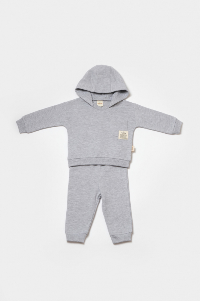 Set hanorac cu gluga si pantaloni Two thread 100%bumbac organic Gri BabyCosy 12-18 Luni
