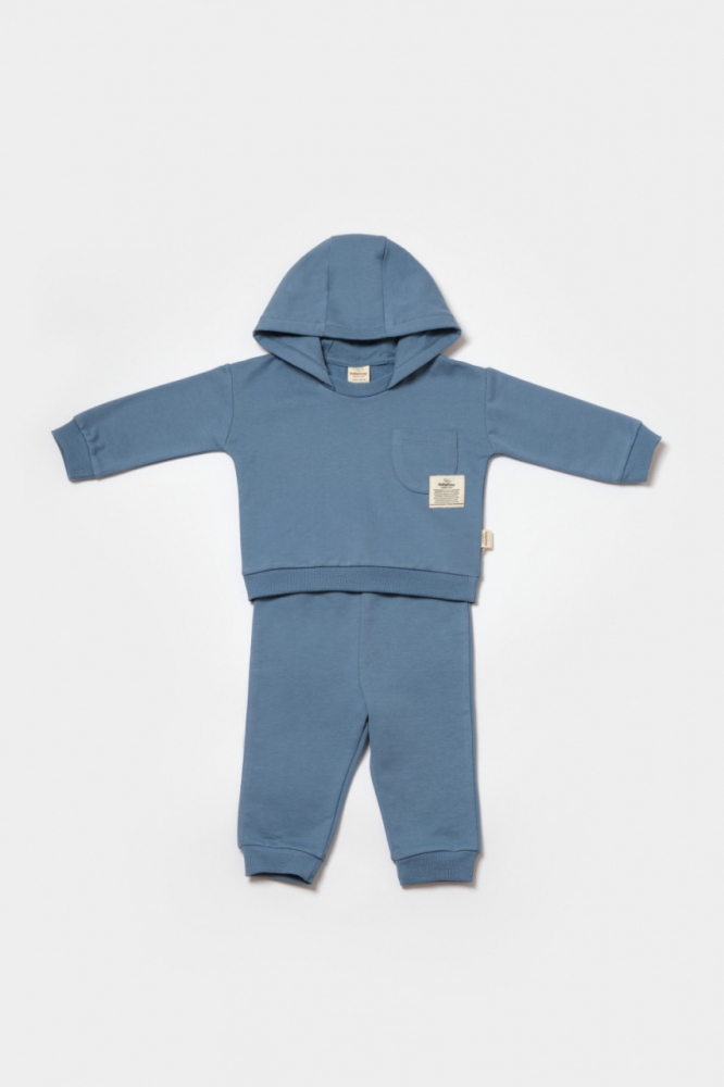 Set hanorac cu gluga si pantaloni Two thread 100%bumbac organic Indigo BabyCosy 9-12 luni