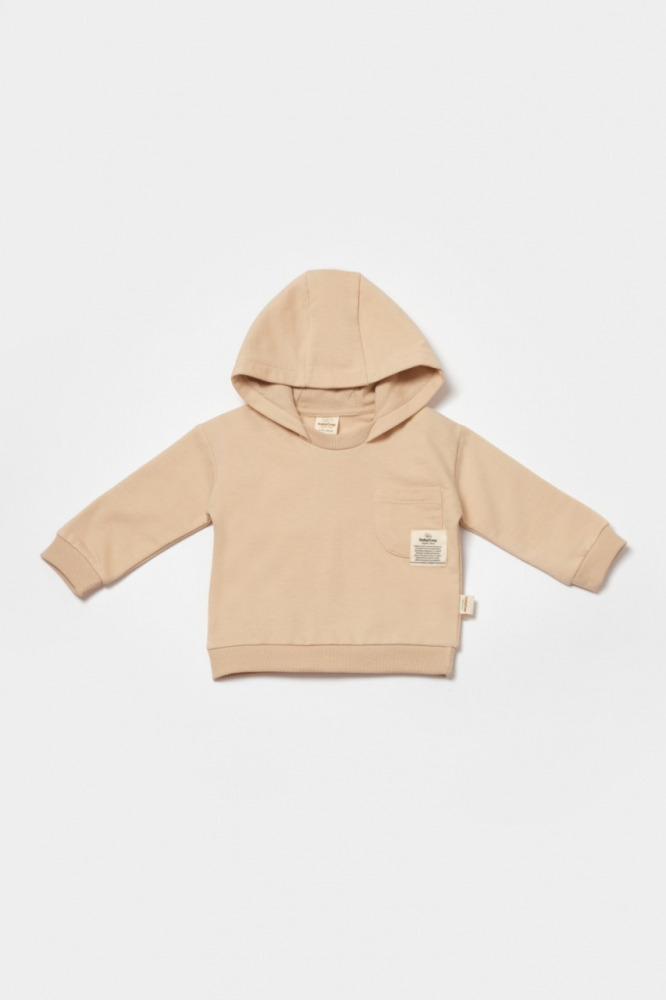 2. Hanoracul cu maneci lungi si gluga, din 100% bumbac organic,are un buzunar decotativ la piept.