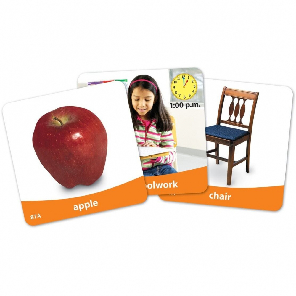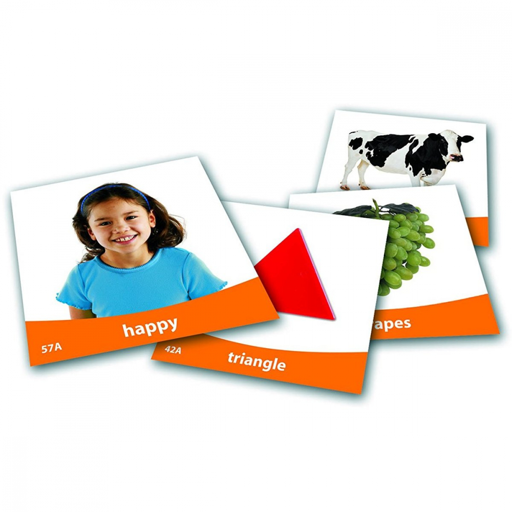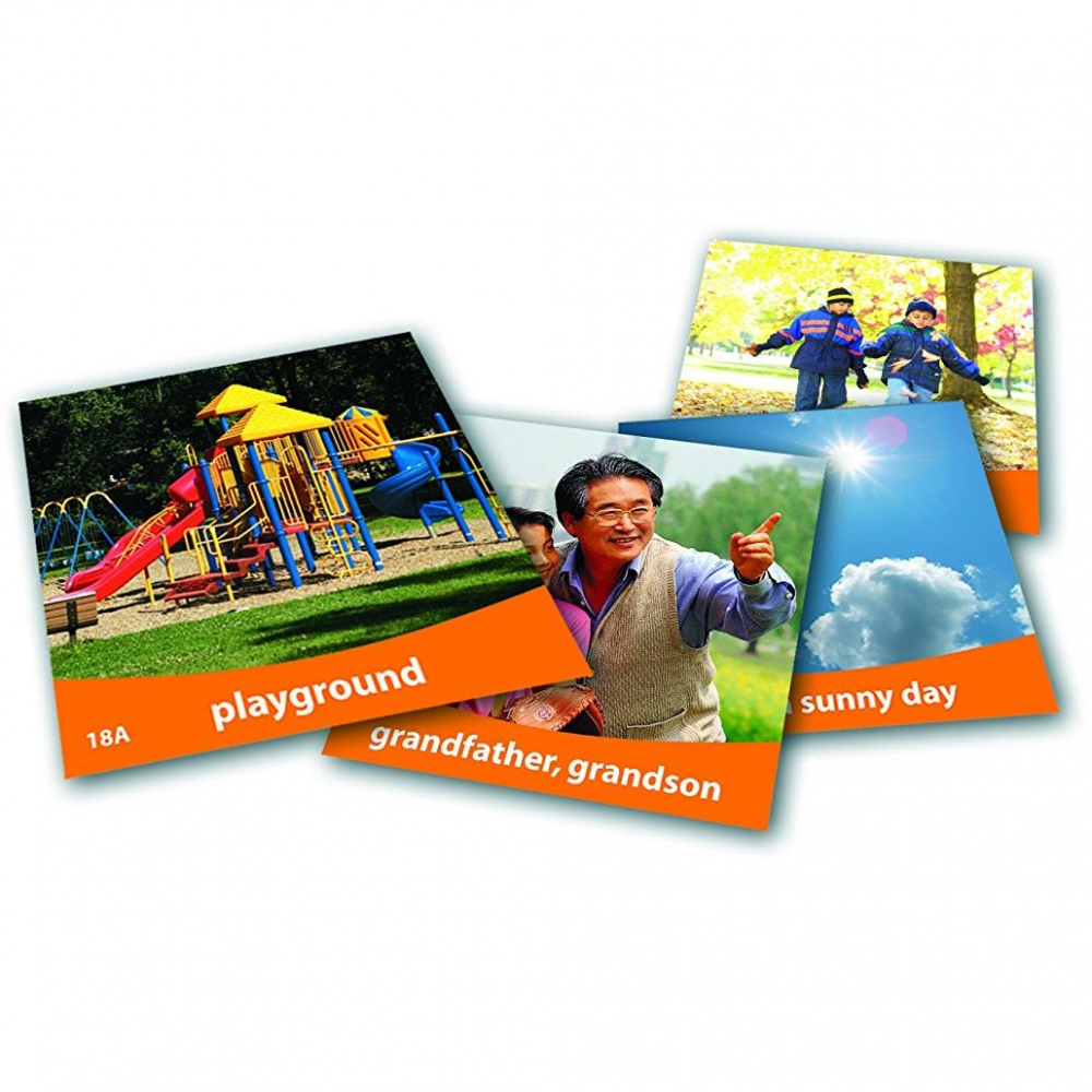 Acest set de carduri colorate ajuta copiii sa isi dezvolte limbajul oral si vocabularul necesar in conversatii cotidiene. Fiecare card are 7.5 cm, o imagine a unui obiect, numele sau si un spatiu liber pentru a putea scrie. Scrisul poate fi sters. Pachetul include ghid de activitate. Produsul este disponibil doar in limba engleza.