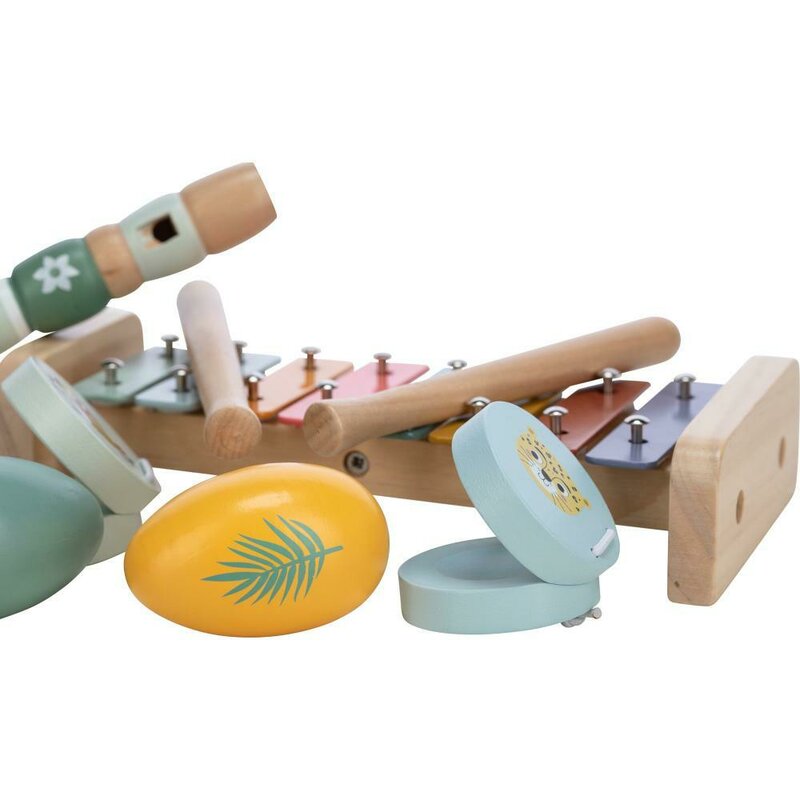 Printre instrumentele din set gasiti un xilofon colorat cu 8 clape, din lemn, ideal pentru a incuraja creativitatea muzicala, pentru a dezvolta coordonarea mana-ochi si aptitudinile de recunoastere a culorilor.