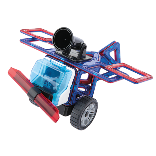 Set Magformers cu 26 de piese cu magnet, de formă pătrată și triunghiulară, cu ajutorul cărora copiii pot să contruiască orice vehicule doresc; setul conține și roți pentru vehicule și o figurină polițist. Posibilitățile și distracția sunt nelimitate, așa că cei mici pot să își lase imaginația liberă și creativitatea lor va prinde cât mai multe forme.