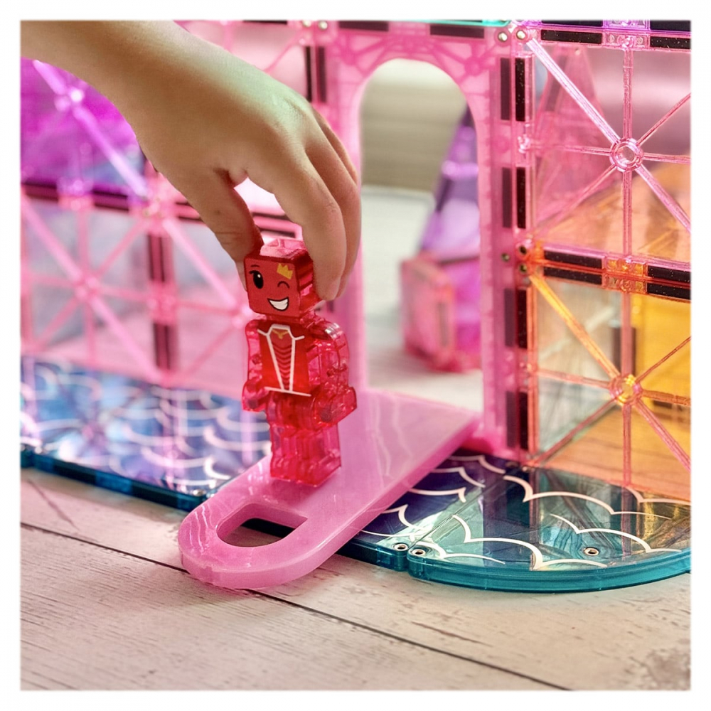 Setul magnetic Castle Deluxe de 48 piese le permite copiilor sa isi creeze propriile aventuri de basm, ofeind un potential nelimitat de povestire, constructie si distractie si o serie de piese inedite: un pod mobil functional, scari in spirala, piese pentru balcon, piese microMAGS, precum si placi Glitter pentru un plus de farmec si stralucire!
