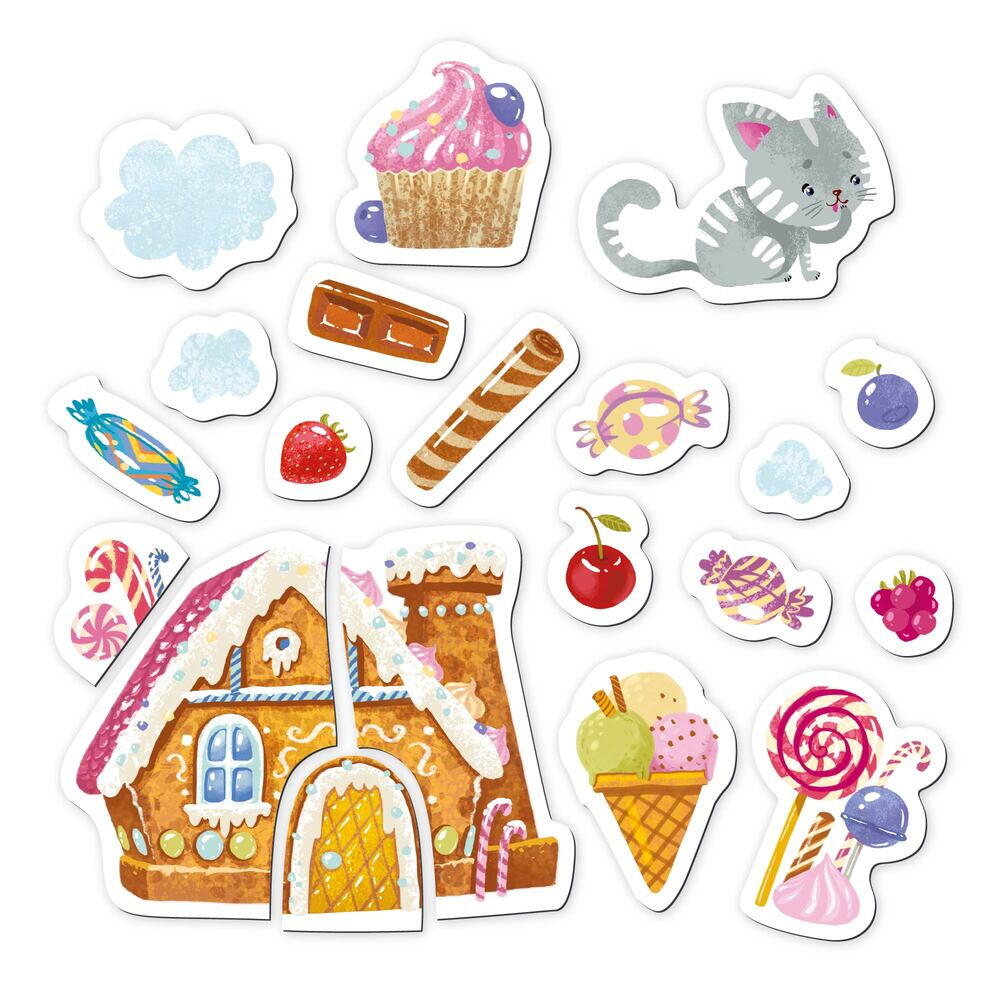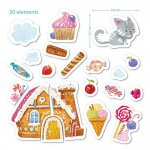 • setul contine 20 de elemente magnetice, inclusiv o pisica adorabila, o casa de turta dulce si diverse dulciuri delicioase