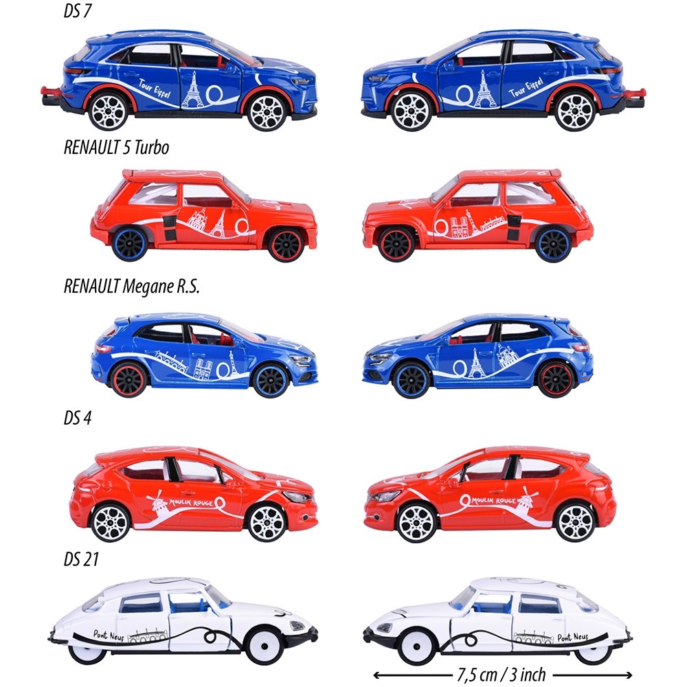 Setul include: DS 7, Renault 5 Turbo, Renault Megane R.S., DS 4, DS 21