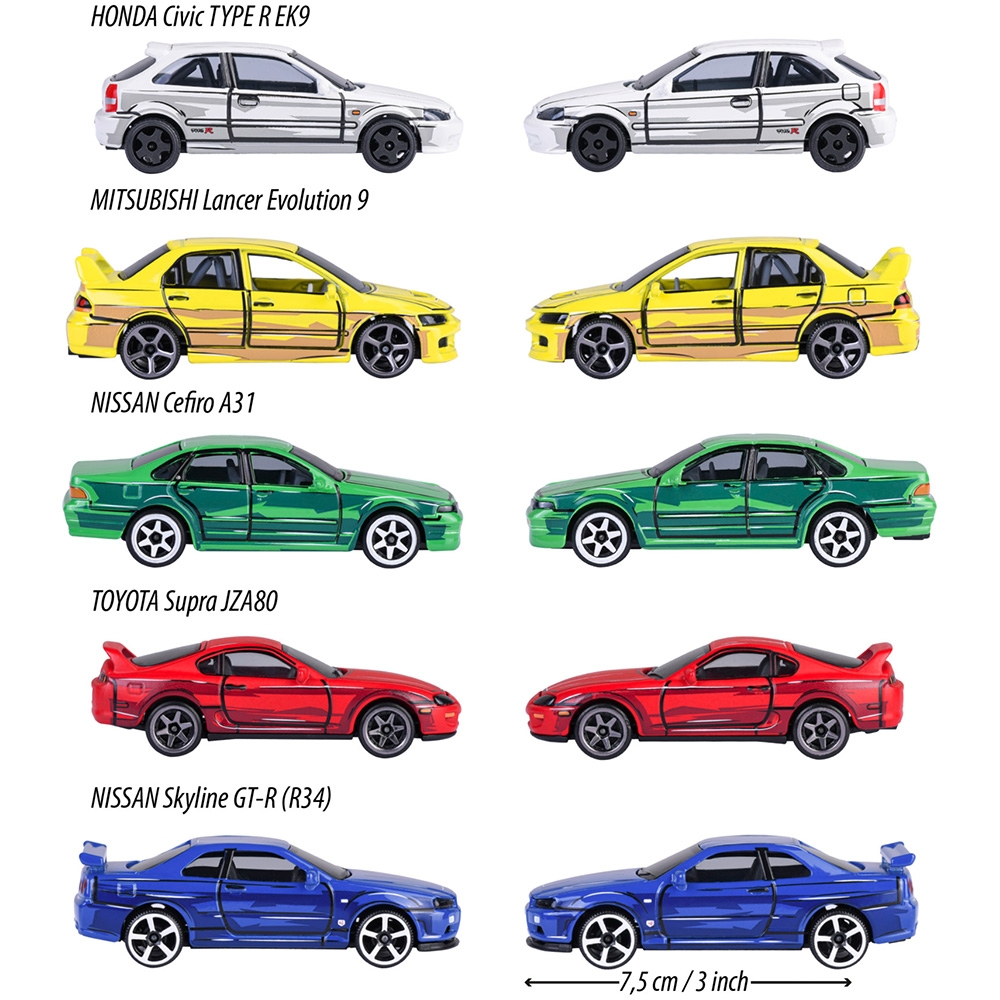 - Setul include: Honda Civic Type R EK9, Mitsubishi Lancer Evolution 9, Nissan Cefiro A31, Toyota Supra JZA80, Nissan Skyline GT-R (R34)