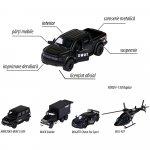 - Acest set de 5 piese include o flota completa de vehicule de transport metalice: 4 vehicule pentru transport rutier si 1 elicopter pentru transport aerian