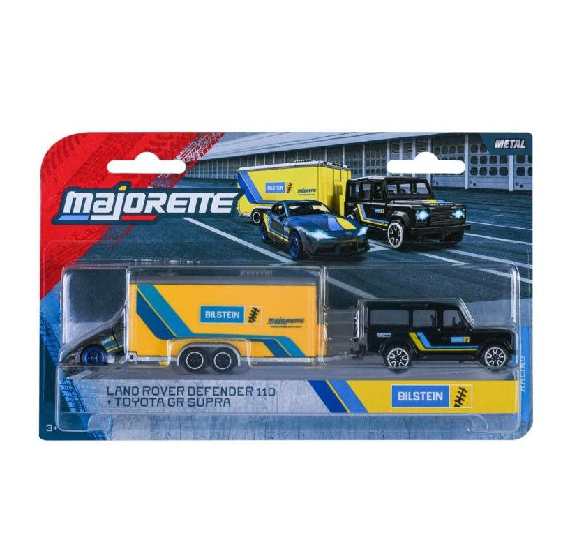 Set Majorette transporter remorca de curse deluxe Land Rover Defender 110 si masinuta Toyota gr Supra