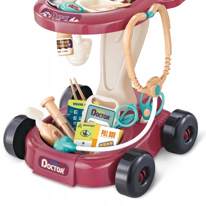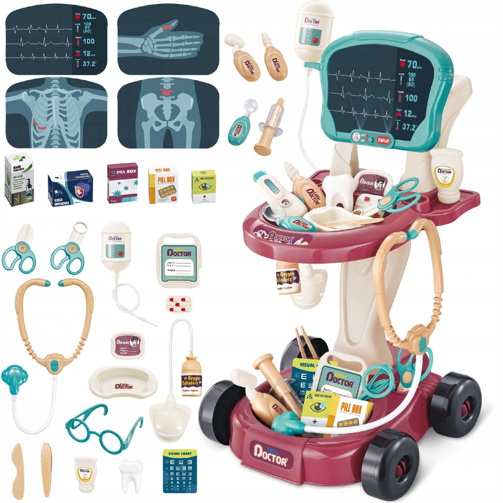 Cărucior + 29 ELEMENTE – numărul de piese permite utilizarea practică a setului; 19 dispozitive medicale și un cărucior pe 2 niveluri cu ECG și imitație de ecran X-ray cu un mâner permit distracția variată, creativă și repetată.