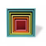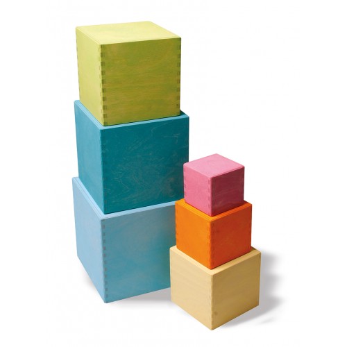 Un set de 6 cutii mari din lemn colorat in culori pastelate, util pentru exersarea abilitatilor de stivuire, ordonare, construire, precum si pentru invatarea culorilor.