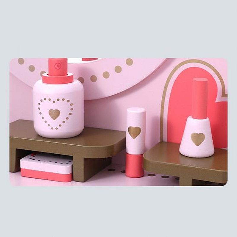 Mobilierul dispune de o oglinda ovala, un sertar in partea centrala si alte 3 rafturi pentru a depozita diverse accesorii, bijuterii sau produse. Pentru a diversifica jucaria, setul include 2 accesorii pentru ingrijirea parului, respectiv un uscator de par din lemn si o perie, precum si produse de machiaj: ruj, o paleta de farduri, oja si parfum.
