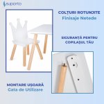 Creat special pentru micuți, cu un design adorabil în formă de coroniță și o culoare albă placută, masa și scaunel copii de la Suporto se integrează ușor în orice decor. Forma prietenoasă adaugă un plus de căldură și bucurie în camera copilului.