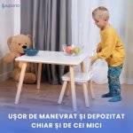 Datorită dimensiunilor compacte, masuța și scăunelele pentru copii pot fi mutate cu ușurință dintr-o cameră în alta, după preferințe și nevoi. Setul este ideal pentru activități precum desenul, joaca, cititul sau chiar micul dejun.