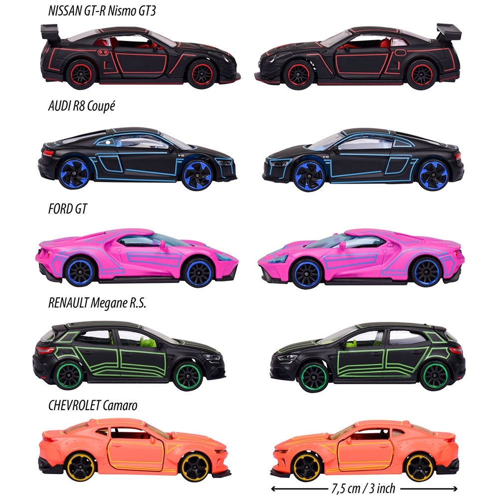 - Setul contine 5 masini de curse in miniatura la scara 1:64 - include 5 modele de masini de curse celebre: Ford GT, Nissan GT-R Nismo GT3, Renault Megane R.S., Chevrolet Camaro si Audi R8 Coupe