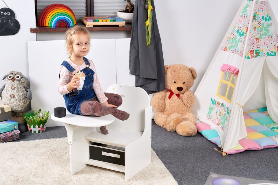 * 3 functii in 1 - Poate fi utilizata cu usurinta ca: masuta pentru scris, invatat sau desenat, scaun pentru sezut si spatiu pentru depozitarea obiectelor diverse.