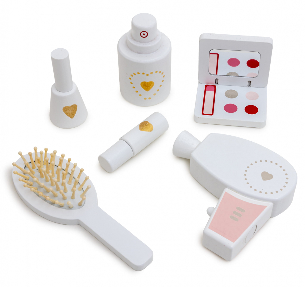 Setul contine:masuta de toaleta cu sertar extensibil, rafturi ,oglinda mare ,scaun ,uscator de par cu buton de pornire/oprire mobil ,sticla de parfum (buton de miscare) ,oja ,paleta de cu farduri de ochi si un aplicator, perie de par ,ruj .