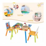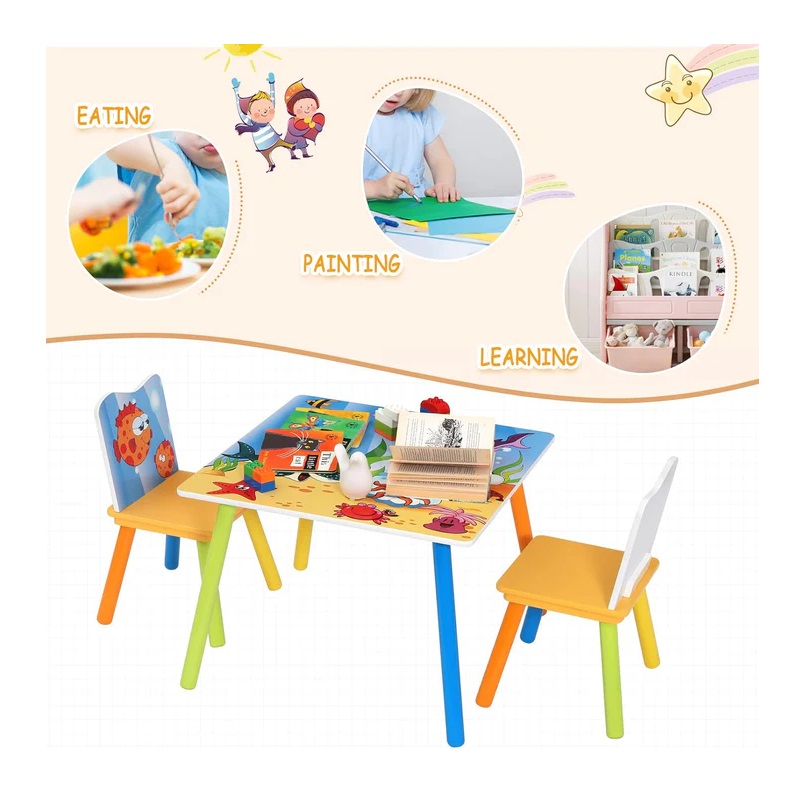 - Masa si scaunele pentru copii au picioare din lemn masiv care sunt concepute pentru a fi puternice si rezistente la impact, asigurand siguranta copilului dumneavoastra chiar si atunci cand sta nelinistit.