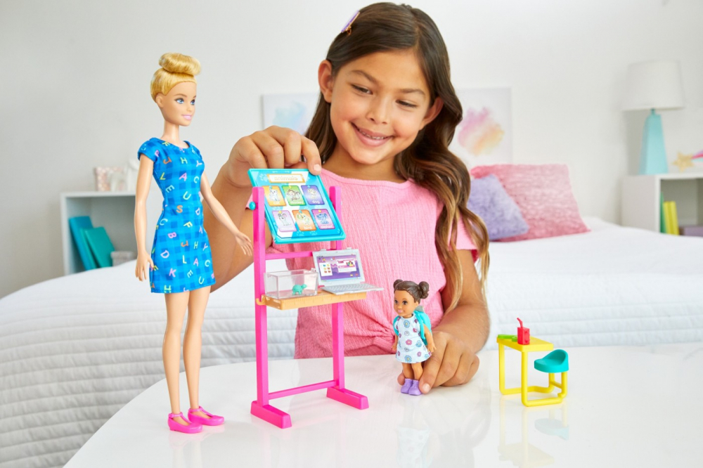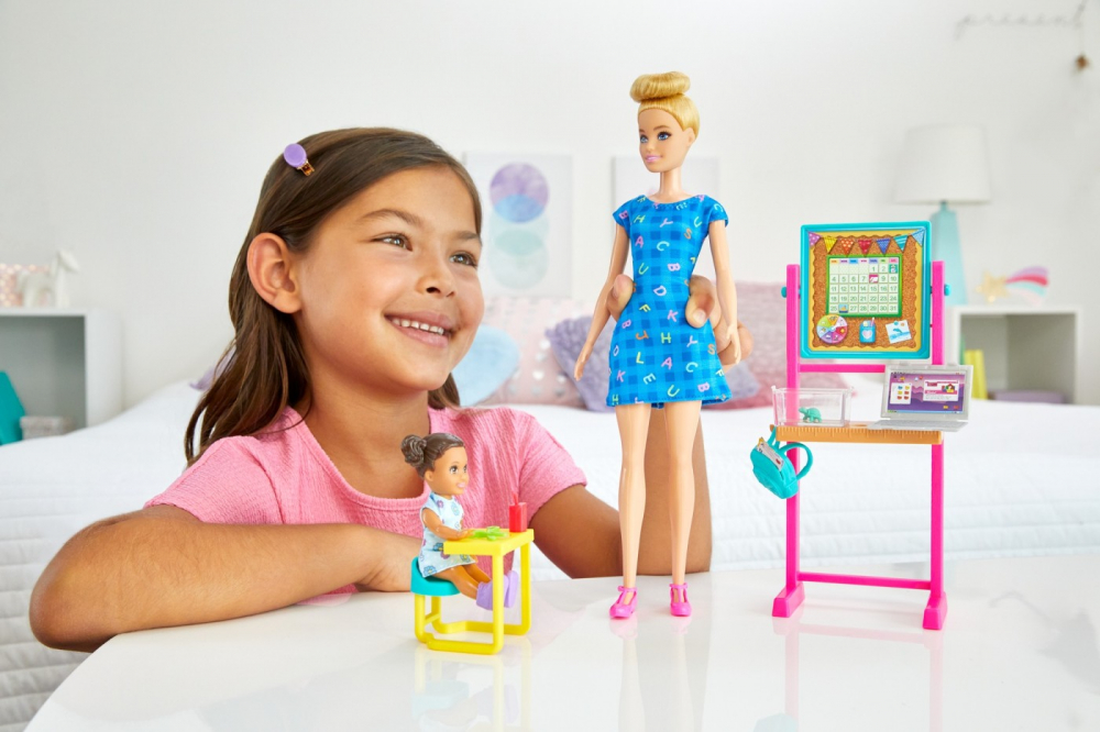 Barbie adora sa ajute si sa inspire copii prin joc, iar acum ei pot alege dintre profesiile preferate, acum ea este o profesoara intr-o sala de clasa.