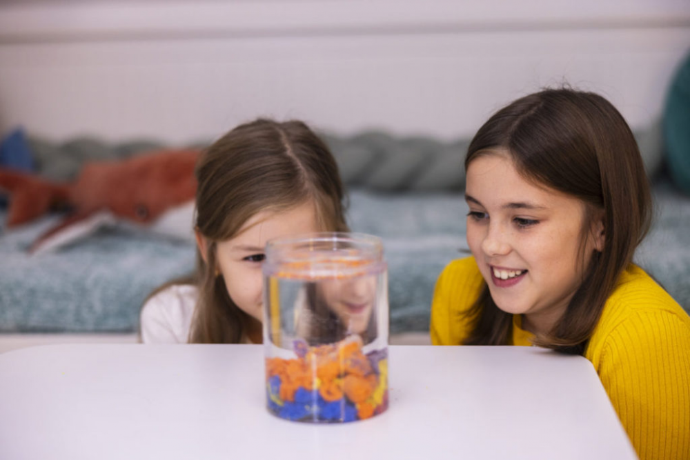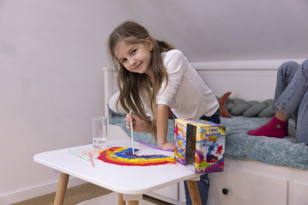 Cea mai fascinanta caracteristica a sa este capacitatea de a respinge apa. Culorile nisipului pot fi combinate in mod liber si aruncate in acvariul umplut cu apa din set. Interesant este faptul ca nisipul este inca uscat dupa ce a fost aruncat in apa. Puteti sa-l scoateti si sa-l scufundati din nou, admirand formele interesante pe care le creeaza.