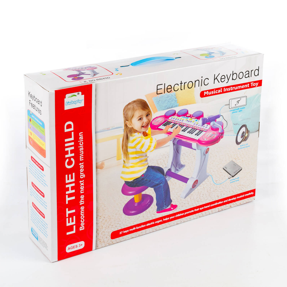 * Orga cu microfon si scaun, este combinatia perfecta intre distractie si invatarea si explorarea lumii muzicii. Este un set fantastic pentru un micut care intra in lumea muzicii si sunetelor.