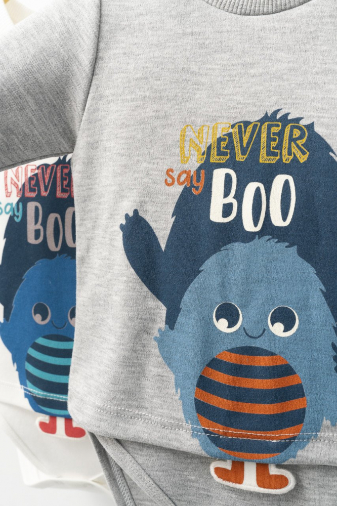 Setul compus din pantalonasi cu buzunare si body cu maneca lunga pentru bebelusi din colectia de toamna Monster reprezinta o combinatie de design spectaculos si confort absolut.