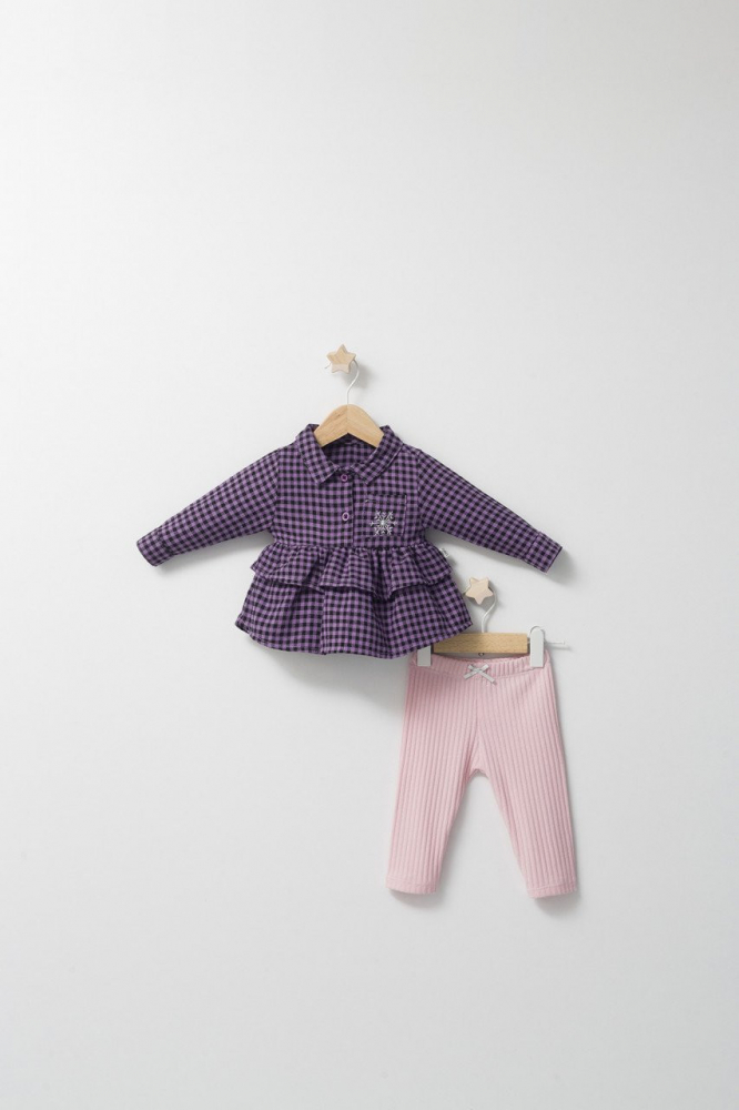 Set pantalonasi si camasuta in carouri Tongs baby Ballon Mov 6-9 luni