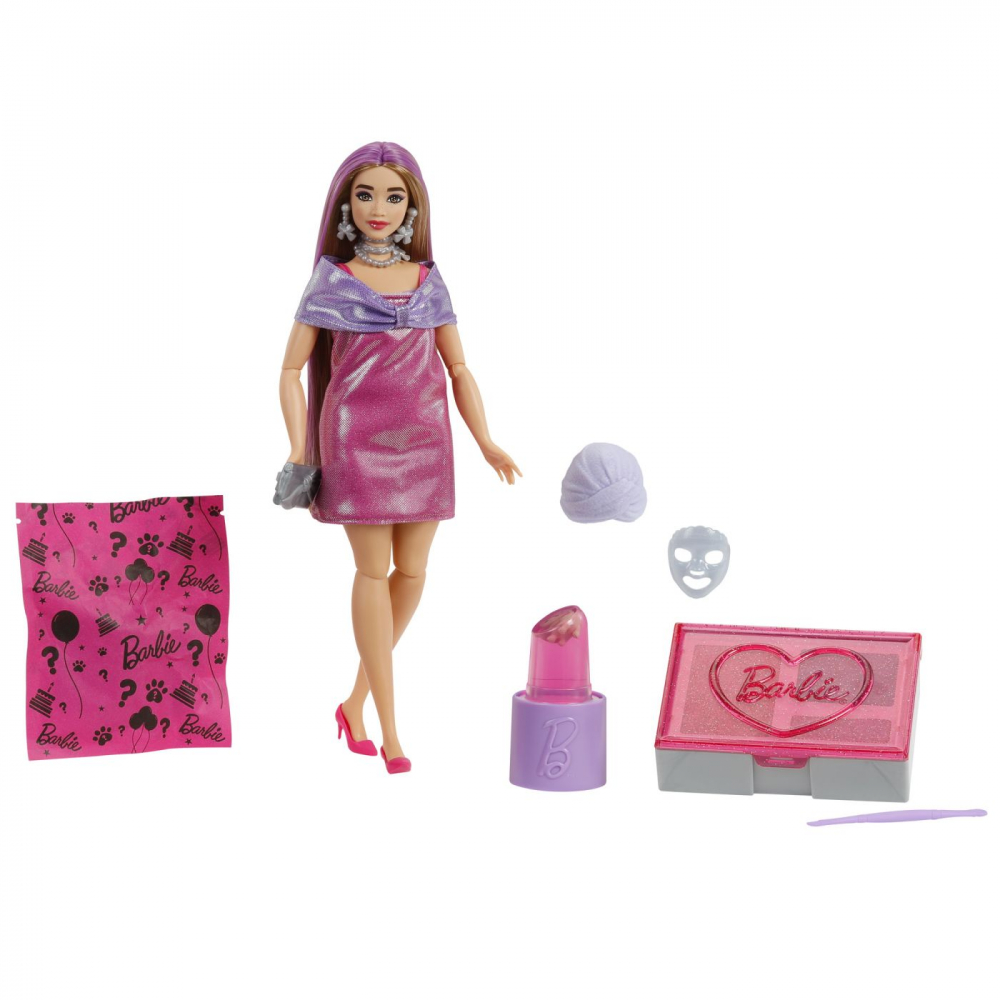 Set papusa Barbie mov party unboxed reveal cu 10 accesorii surpriza