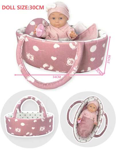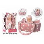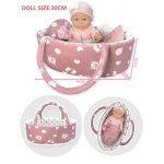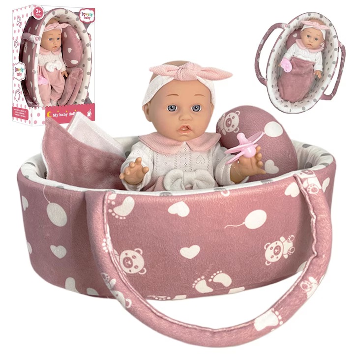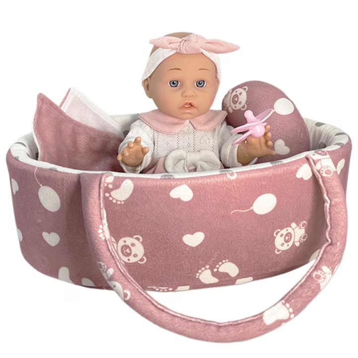 Set papusa bebe in cosulet de transport Malplay, cu perna, paturica si suzeta roz incluse, inaltime 30 cm
