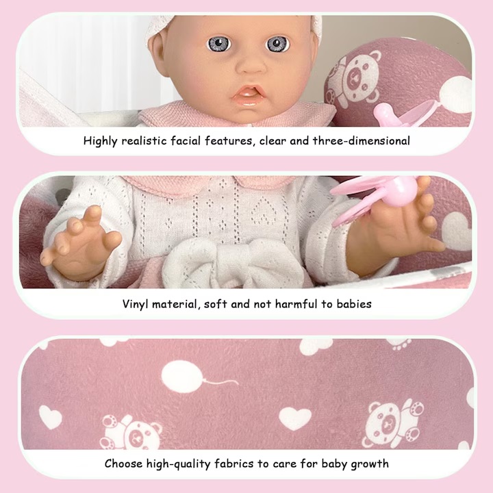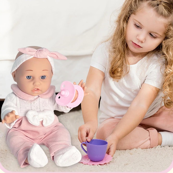 Papusa: Fabricata din vinil, un material moale si sigur pentru copii.