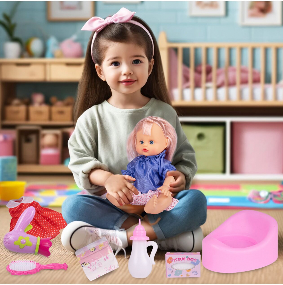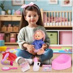 * Accesoriile incluse in set , cum ar fi biberonul, scutecul sau olita, ajuta la invatarea activitatilor de ingrijire de baza, care pot fi utile in viata de zi cu zi.
