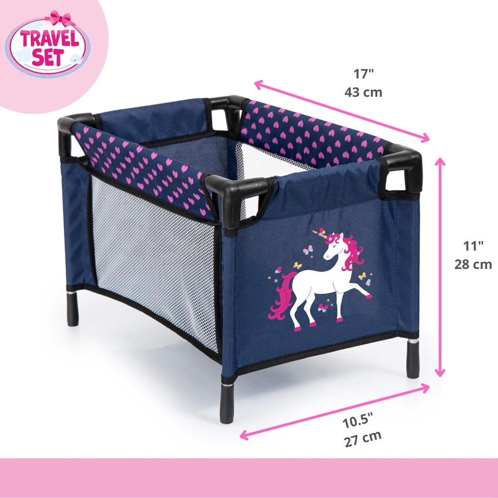 Set patut papusi cu saculet de dormit si accesorii hranire incluse Travel Set Unicorn