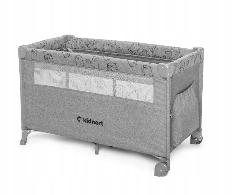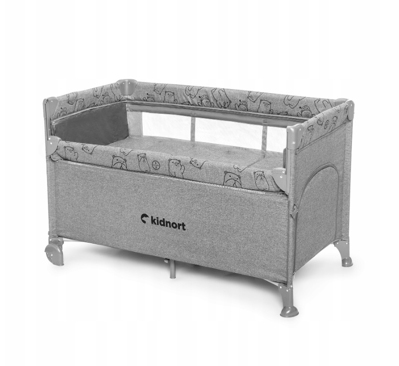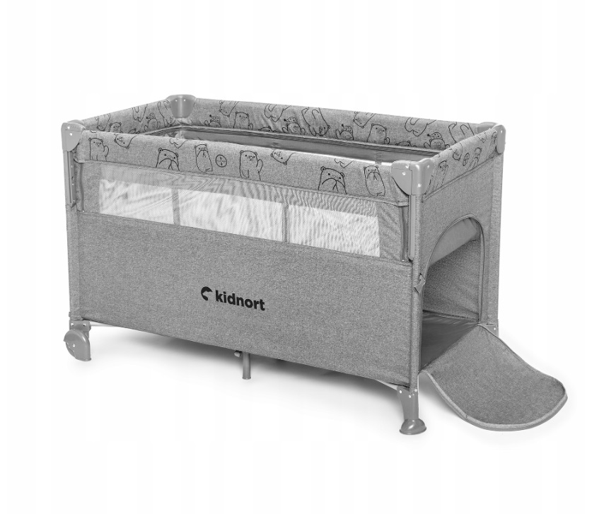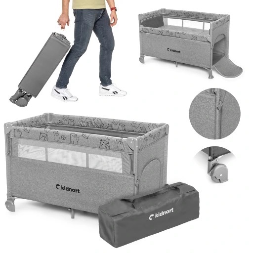 Set Patut pliabil 3 in 1 pentru copii,Kidnort,cu doua nivele,laterala culisanta,plasa de ventilatie,saltea pliabila si geanta de transport incluse,dimensiune 128x78.5x68 cm, Livsmiljo Light Grey + Saltea cocos Comfort 8 cm
