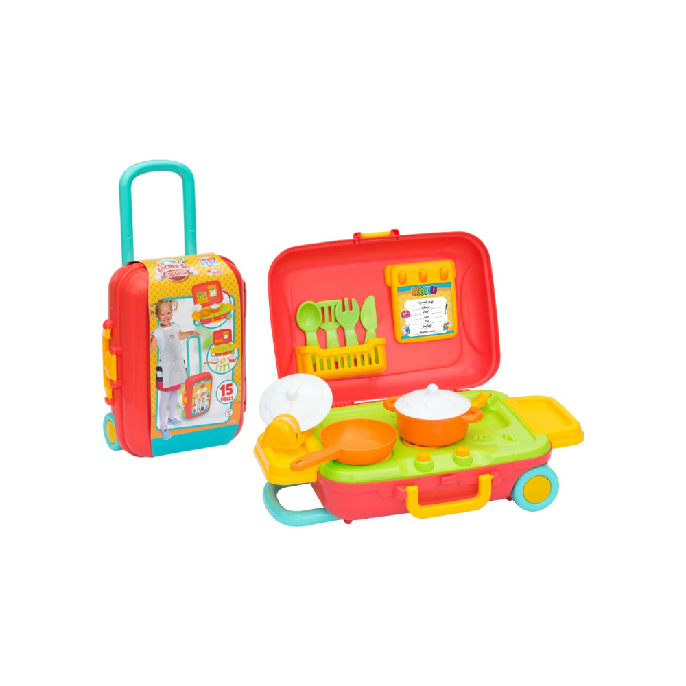 Set de Gatit pentru Copii- Include 12 Piese, Aragaz, Chiuveta, Oala cu Capac, Tacamuri, Tigaie, Suport Vase, Meniu, Cutie Depozitare Valiza