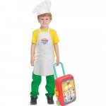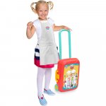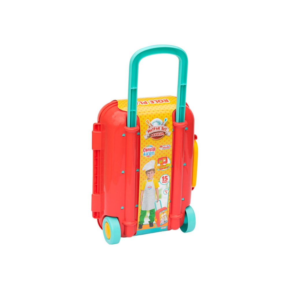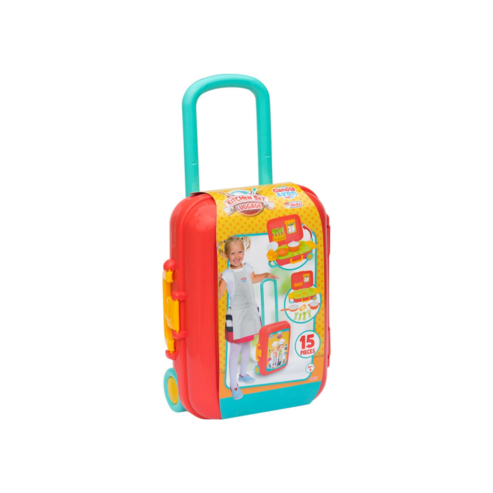 * Continutul setului: Valiza cu roti si maner, Tigaie cu capac, Oala cu capac, Suport pentru tacamuri, 4 Tacamuri, Suport vase, Aragaz, Chiuveta, Meniu