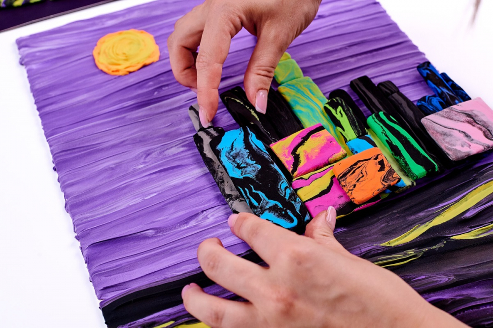 Am creat o argila speciala care nu se lipeste si nu lasa urme pe maini, este usor de modelat si aplicat, culorile imbinandu-se armonios.