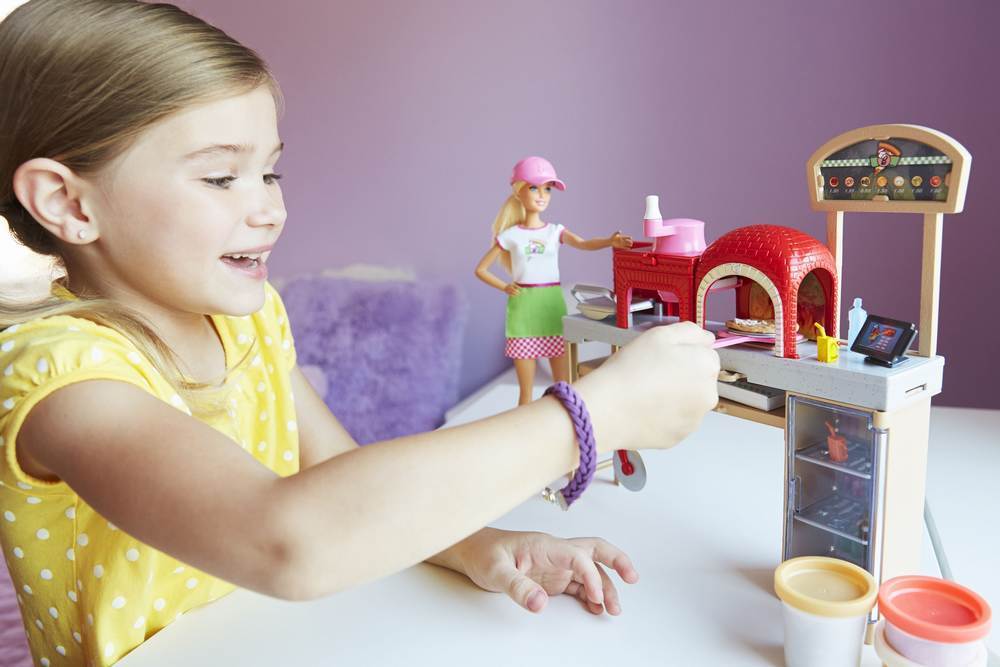 Papusa Barbie Pizza Chef este pregatita sa gateasca cu un set de jucarii pentru pizza, trei culori de aluat si accesorii care le permite copiilor sa-si faca propriile pizze de papusi!