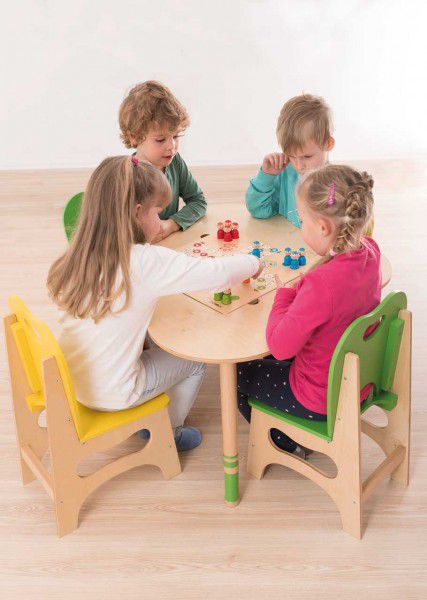 Contine o masuta si 4 scaune foarte atractive, colorate din lemn bine finisat.