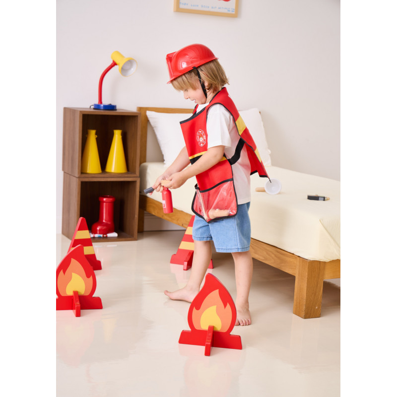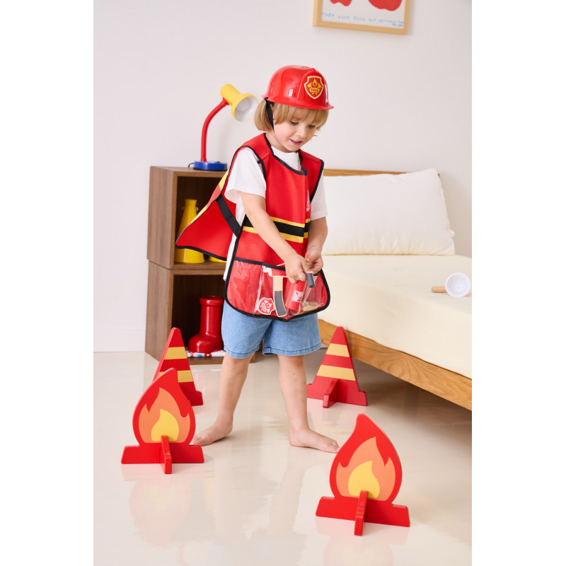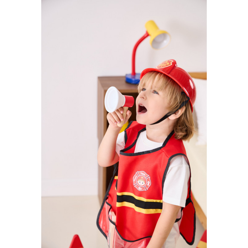 Acest set de joaca de rol include o casca, o vesta de pompier, un extinctor, un walkie-talkie, o insigna, un topor, o lanterna si un claxon. Toate pot fi depozitate convenabil pe vesta.