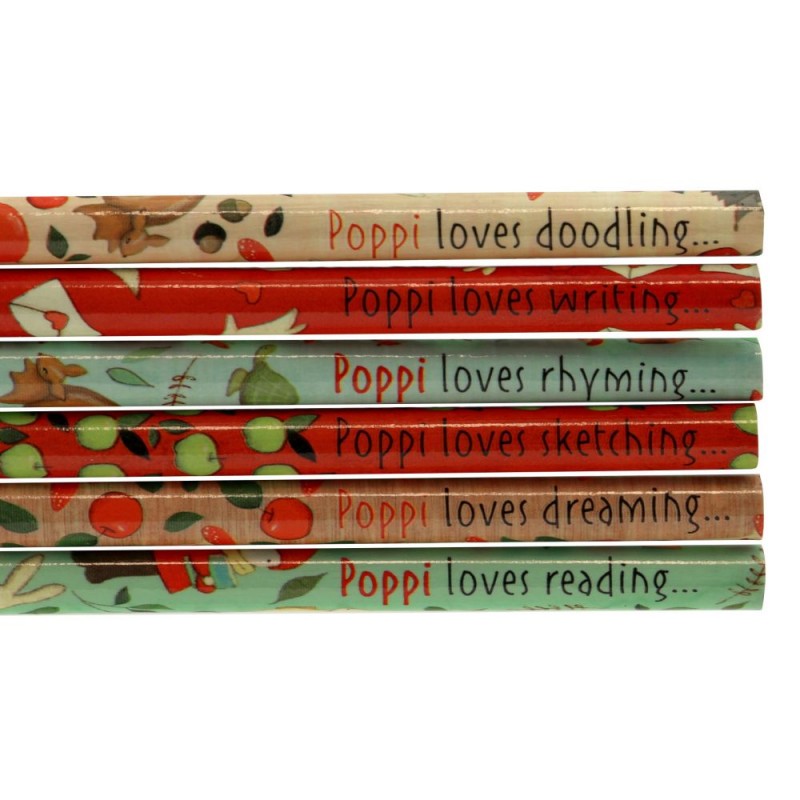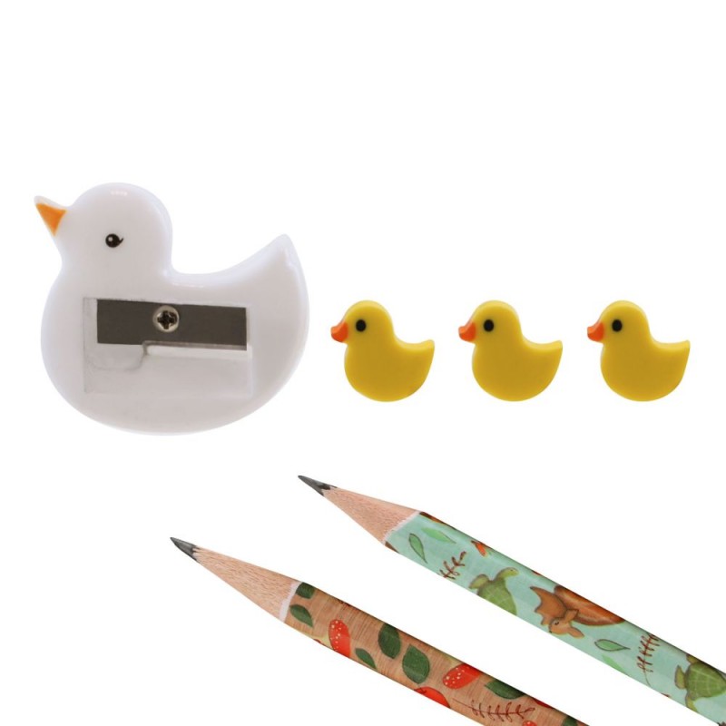 Setul mai cuprinde o ascutitoare alba in forma de ratusca, 3 radiere galbene, tot in forma de ratusca si 6 creioane, frumos decorate cu personajele si culorile colectiei "Poppi love".