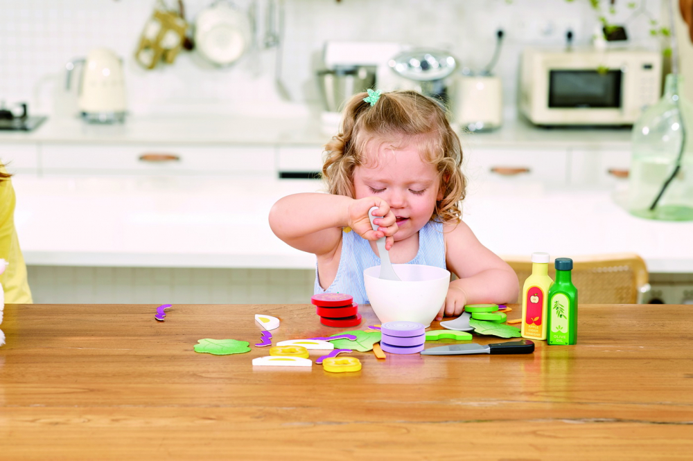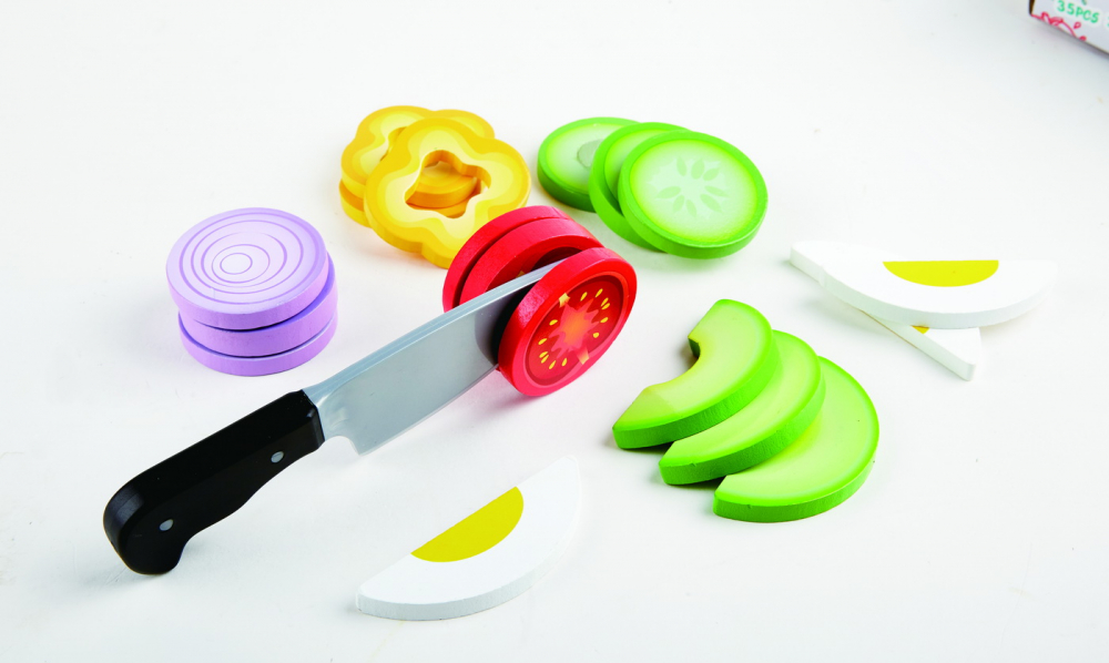 Include bucati de ou, avocado, castraveti, rosii, ceapa si alte legume care pot fi feliate cu ajutorul cutitului de joc realist.