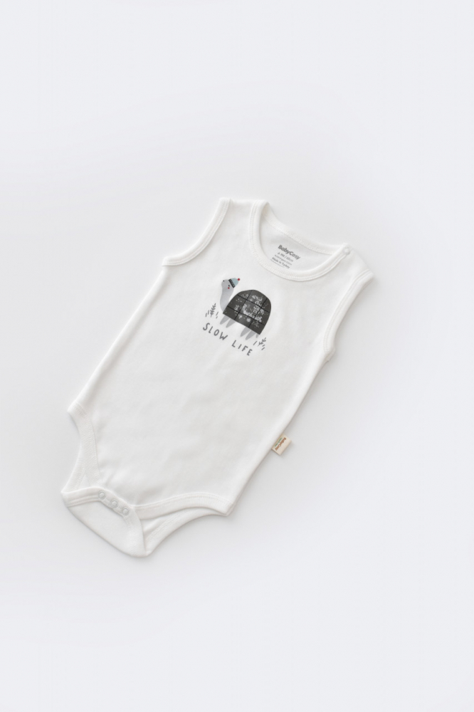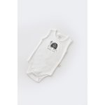 - Body-ul fara maneci, din 100% bumbac organic, se inchide cu capse intre picioruse si la umar. De asemenea, are printata o mica broscuta testoasa - acelasi desen ce se afla si pe salopetica